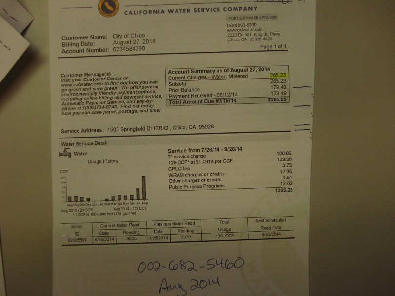 Here’s the bill for irrigating the medians at Forrest and Springfield. A few months earlier I had called in to report those sprinklers were running all over Forrest Avenue and $taff acted like they didn’t even know they had sprinklers on Springfield Drive.