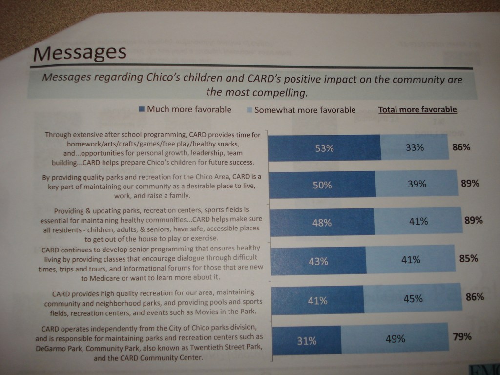 This should all be familiar to you – this was the same strategy used to Chico Area Recreation District consultants when they rolled out the ill-fated Measure A in March 2020. CARD consultants used the same game plan – early mailers to get people thinking positive about CARD, then a survey, then videos and more mailers based on what they thought they found out from the surveys.