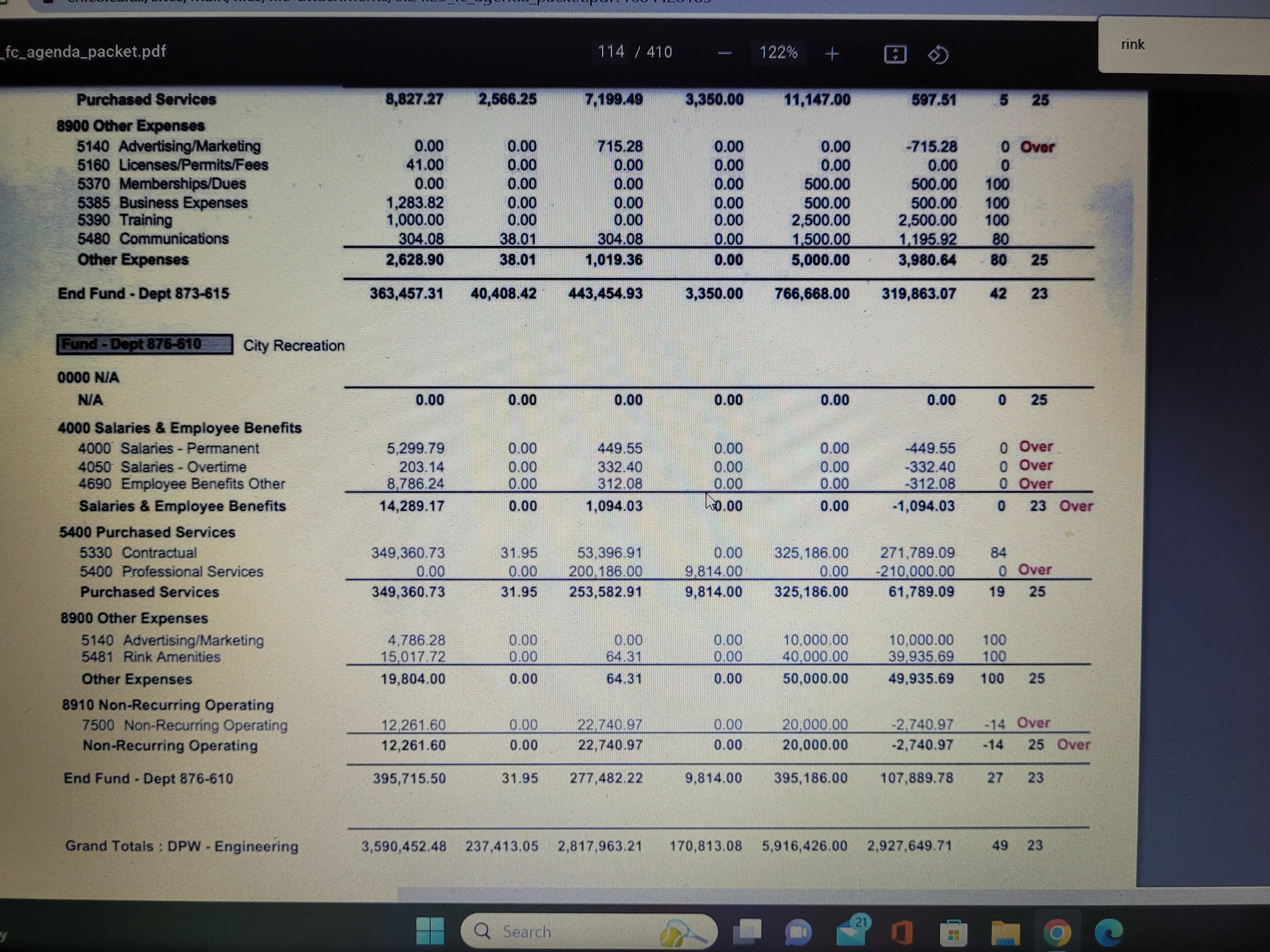 “Item #6 Location: City Recreation Expenditure Category: 876-610-4000 Description: Salaries & Employee Benefits Analysis: This category is tracking behind due to additional staff working on ice rink. Action Plan: Finance is taking a supplemental to Council to adjust budget to align with actual costs.“