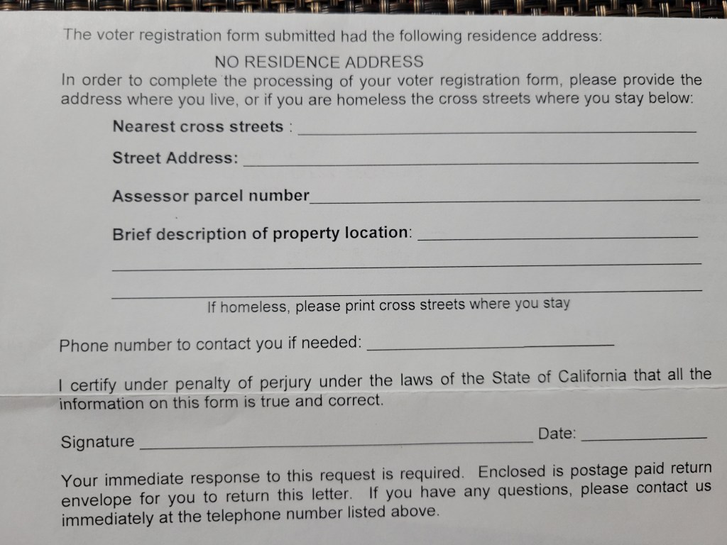 I read it over a few times, I was corn-fused. You can register to vote without a legal residence? With nothing more than cross streets and a brief description? Then excuse me, why the hell do they need my residence address? Assessor parcel number?